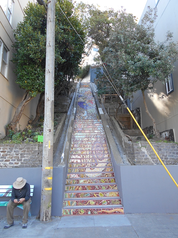 C’est mathématique. San Francisco est une ville mondialement connue pour la raideur de ses rues. Alors qu’en France, les panneaux routiers signalent une inclinaison supérieure à 5%, les voies de circulation à SF ont souvent des inclinaisons supérieures à 25% (voire 27.5% pour Lombard Street et 31.5% entre la 22ème rue et Filbert street). Pas étonnant alors que la ville possède aussi des escaliers, originaux et décorés de mosaïque, un peu partout dans chaque quartier. En route, ou plutôt, en marche !