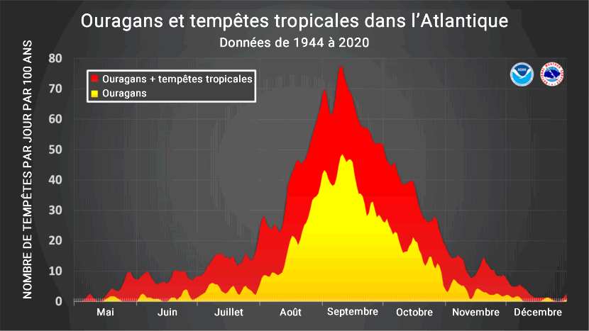 La saison active commence le 1er juin et se termine le 30 novembre. La période la plus active est de mi-août à fin octobre avec un pic autour du 10 septembre. Il n’est pas rare que des ouragans se forment avant ou après ces dates.
