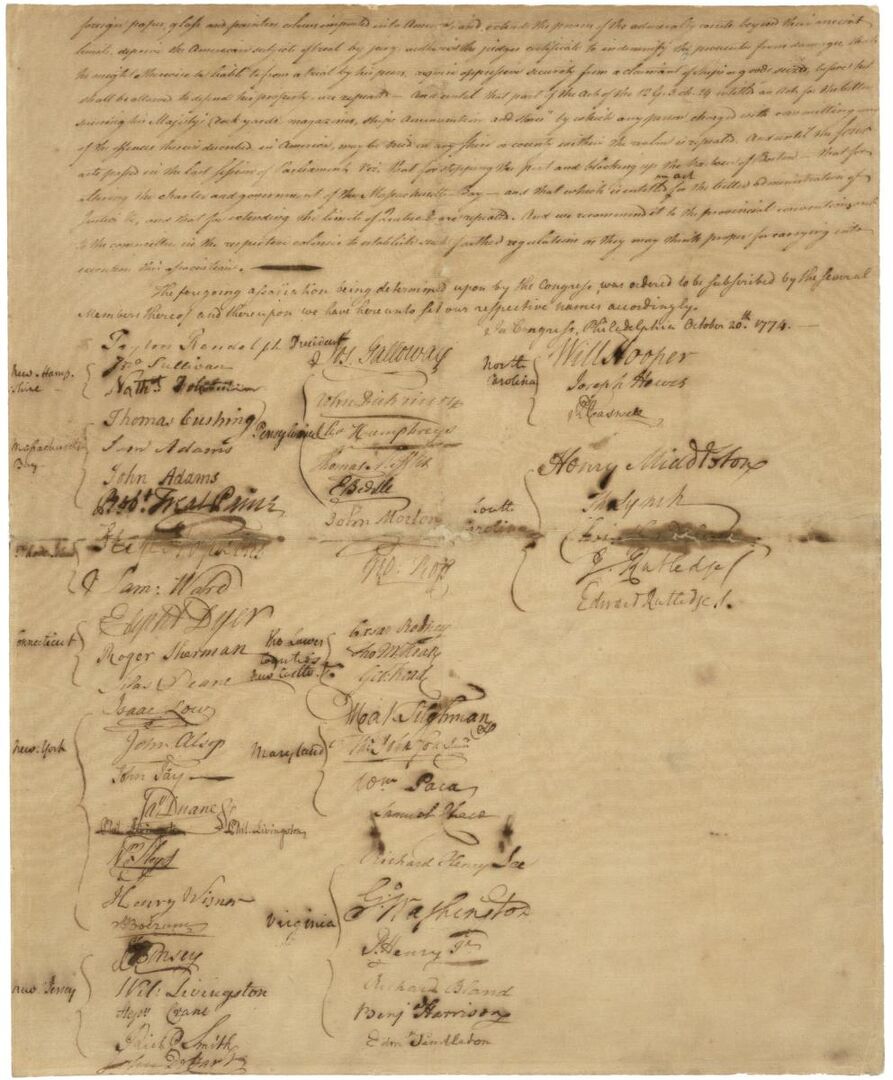 Signé par l’ensemble des 53 délégués, ce document fondateur appelle au boycott strict des produits britanniques. Il s’agit du tout premier acte de résistance officiel et unifié du Congrès continental contre la Grande-Bretagne.