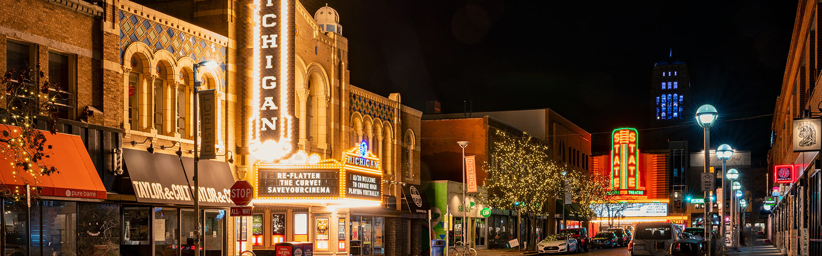 Les enseignes lumineuses du Michigan Theater et du State Theater à Ann Arbor, dans le Michigan. Crédit photo : Brad Switzer.