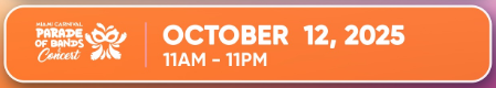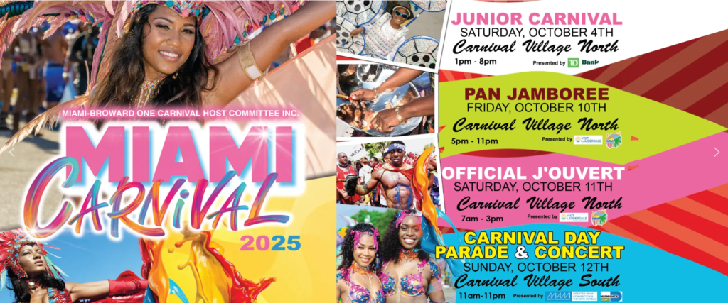 Le carnaval traditionnel, tel qu’il est célébré à Trinidad et au Brésil, est une période festive qui a lieu chaque année juste avant le Carême, généralement en février ou mars. Ici, dans le sud de la Floride, les célébrations du carnaval de Miami commencent la semaine précédant le Columbus Day en octobre. En octobre 2025, il débutera avec le concours Junior Carnival le samedi 4 octobre, suivi du concours Steelband « Panorama » le vendredi 10 octobre. J’Ouvert a lieu tôt le samedi matin 11 octobre, et les célébrations du carnaval culminent avec les rois, les reines et les spectacles et concours individuels et le grand final avec le défilé et le concert du Parade of Bands le dimanche 12 octobre.